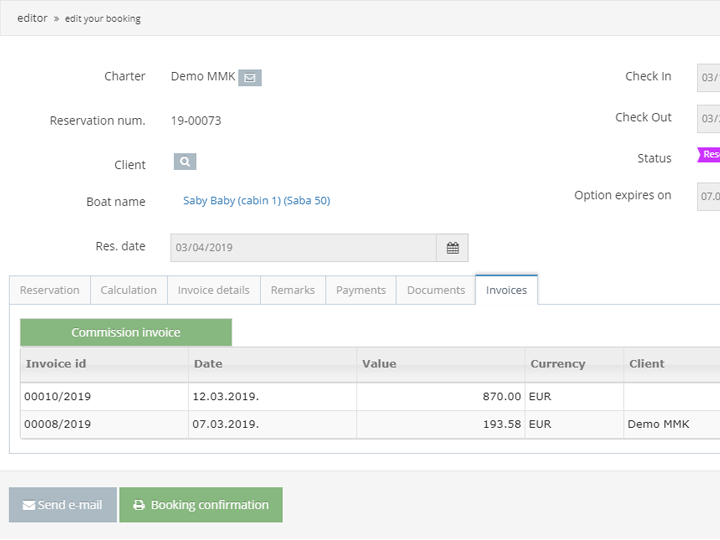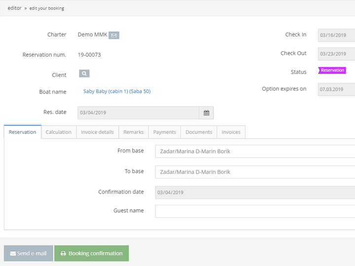 My Bookings Editor enables agencies to check all important information which relates to booking, Yacht, client and payments, as well as info related to Calculation and options payable at the base. Agency invoice price displays agency profit and all documents that are prepared for sending to the client.